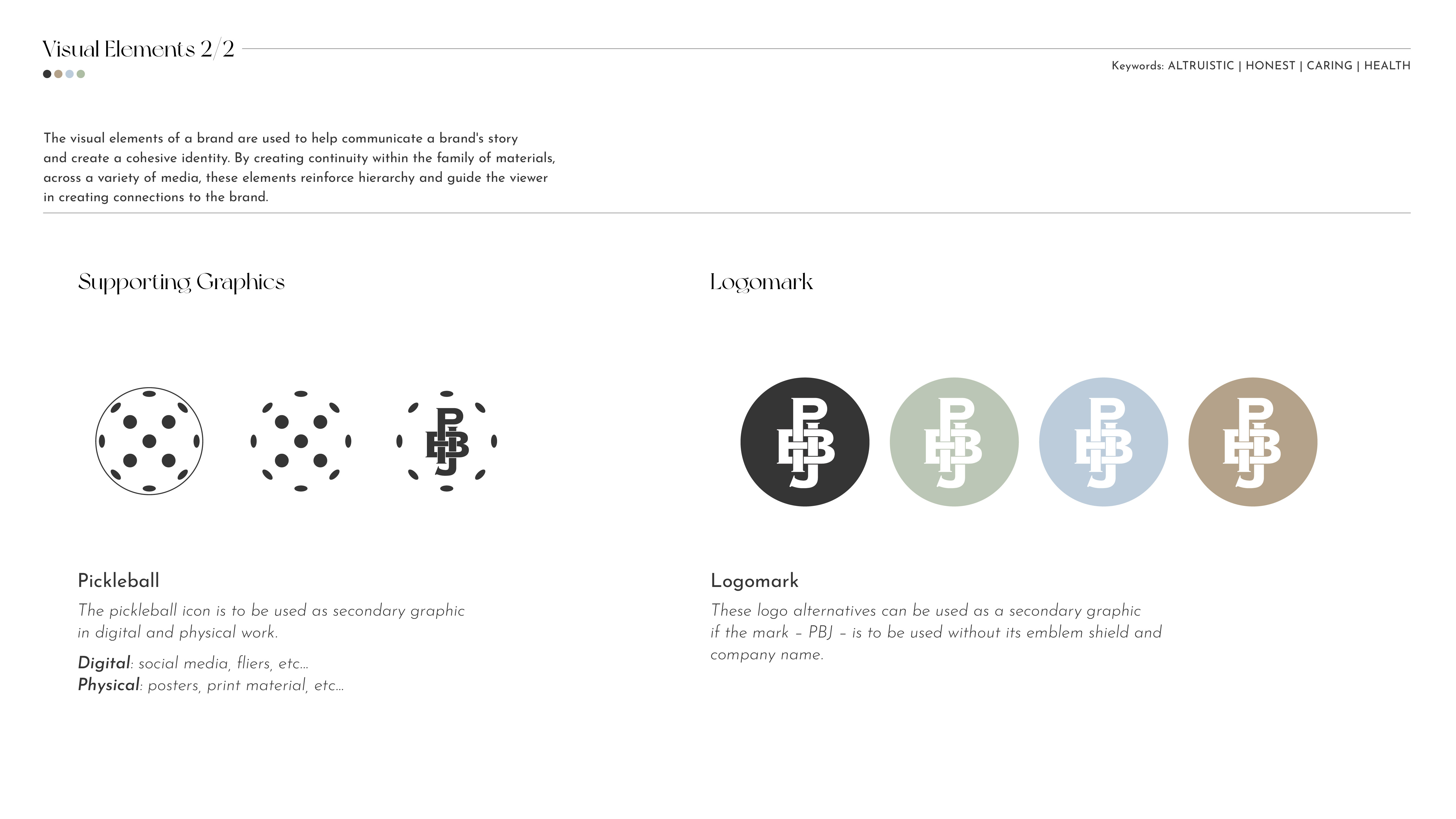 Pickleball Joy’s brand guidelines are designed to capture the energy, inclusivity, and playfulness of the sport while maintaining a clean, cohesive visual identity. The system balances bold, modern design with approachable, human elements—making the brand feel both active and welcoming. These guidelines ensure that whether Pickleball Joy appears on apparel, digital platforms, or in-person events, it always communicates movement, community, and joy in a consistent and recognizable way.